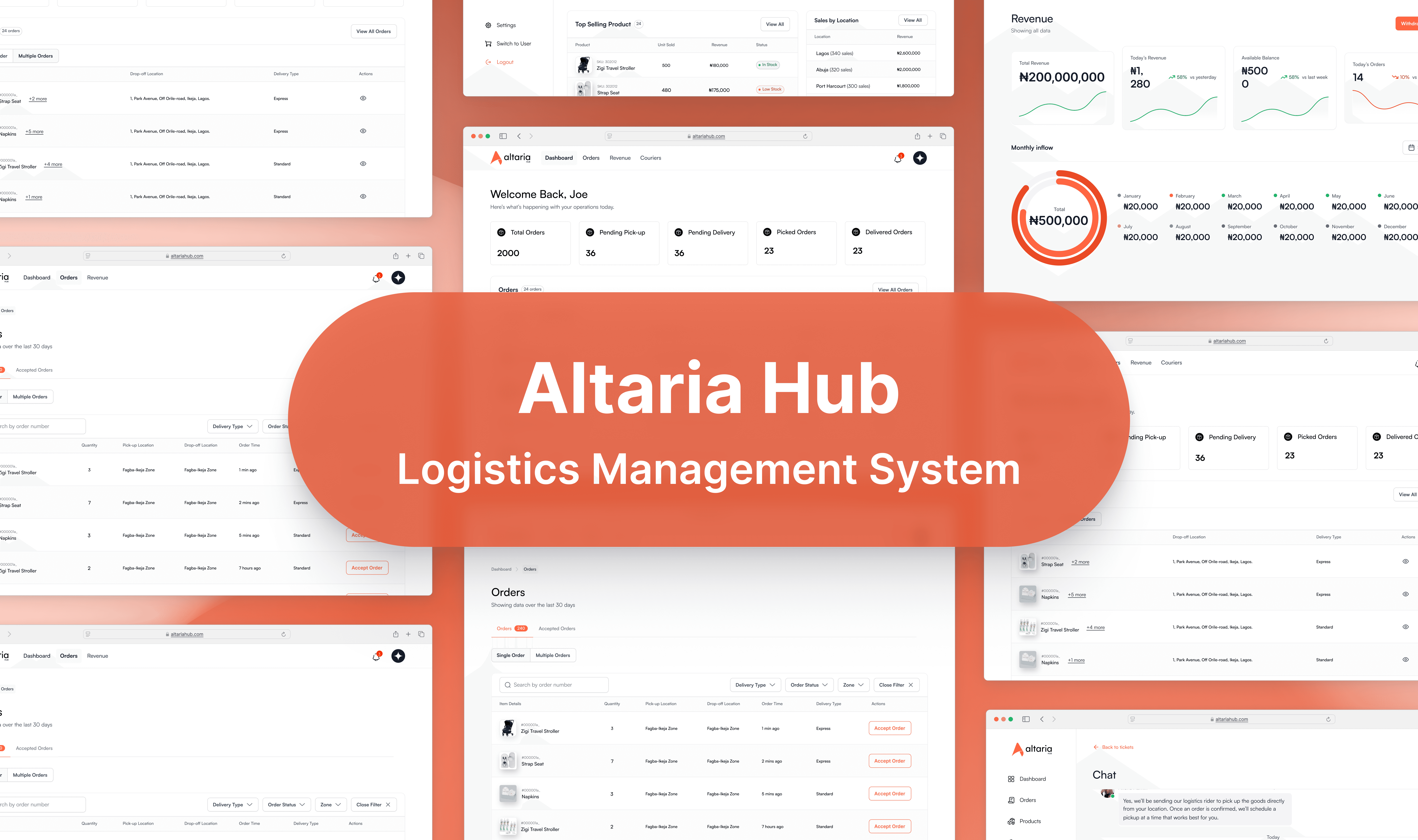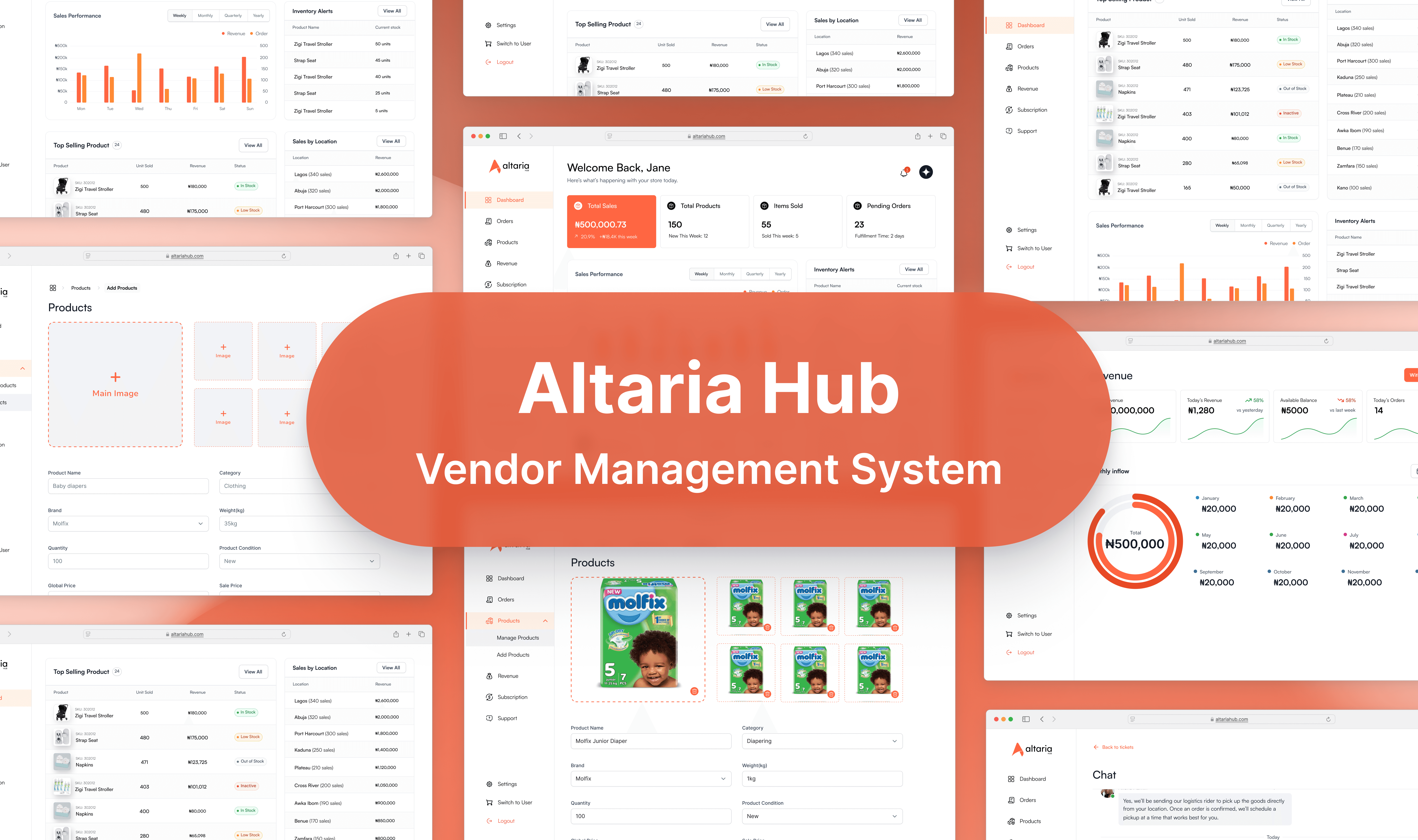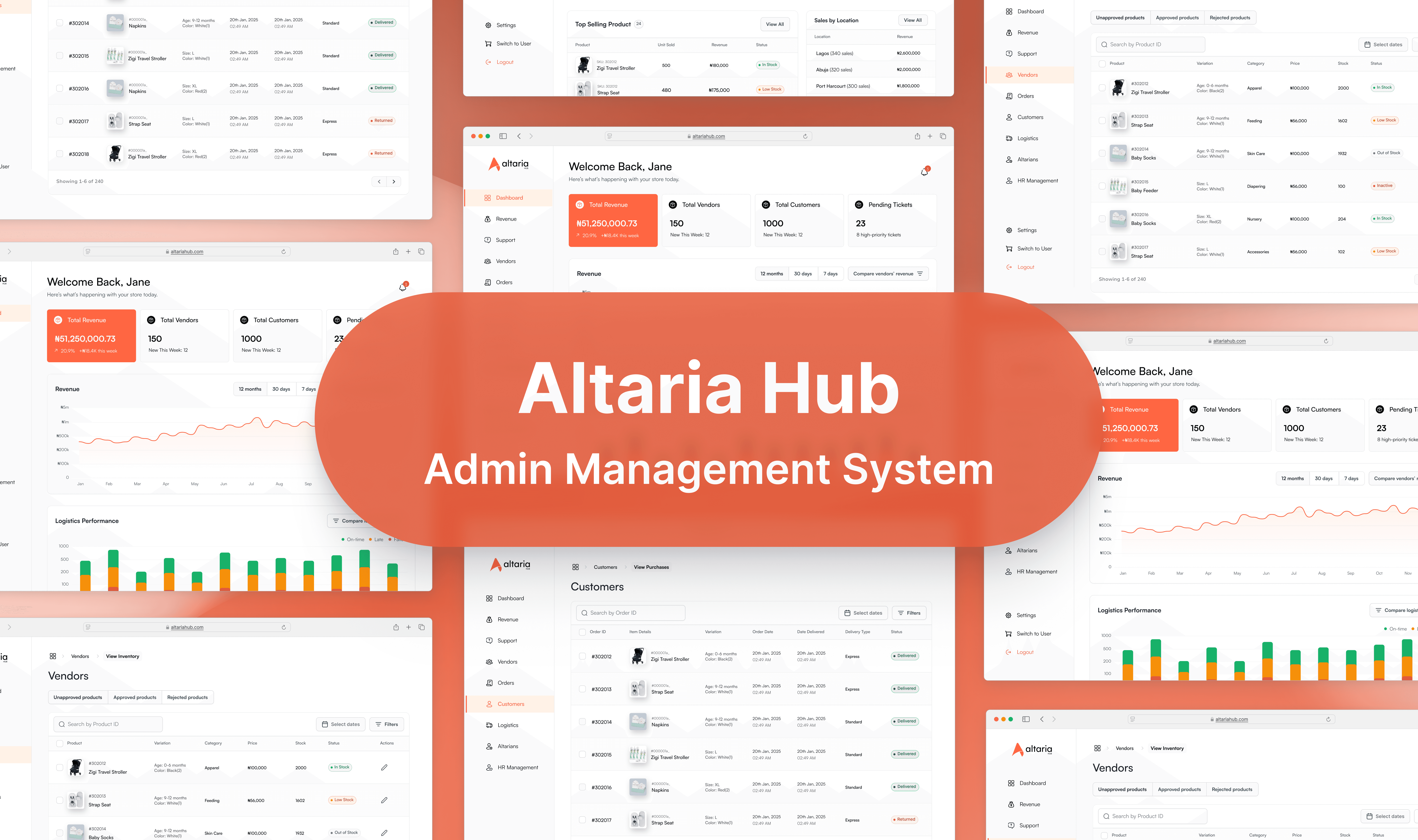 To support the multi-sided ecosystem of Altaria Hub, I designed a set of management portals for key stakeholders which are vendors, logistics partners, and platform admins. These portals enable businesses to efficiently manage products, track orders, coordinate deliveries, and oversee platform operations, all while maintaining a seamless and intuitive experience. The design focused on clarity, usability, and scalability to ensure that each user group could accomplish their tasks quickly and effectively.